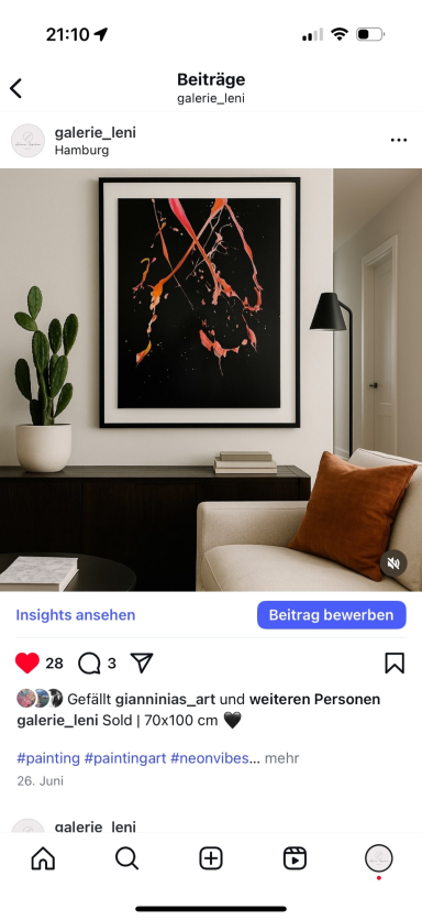 Willkommen in der Welt der Kunst. Hier finden Sie Werke, die Räume verwandeln und Geschichten erzählen. Gerne erschaffe ich auch individuelle Auftragsarbeiten, die Ihre persönlichen Vorstellungen und Visionen zum Leben bringen.